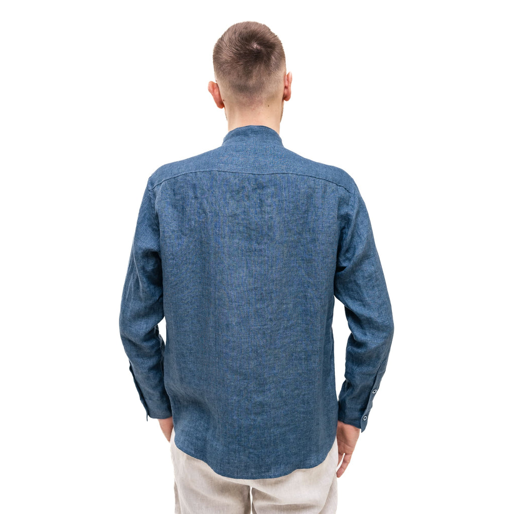 Dark blue Men`s Linen Band Collar Shirt